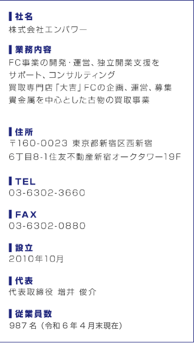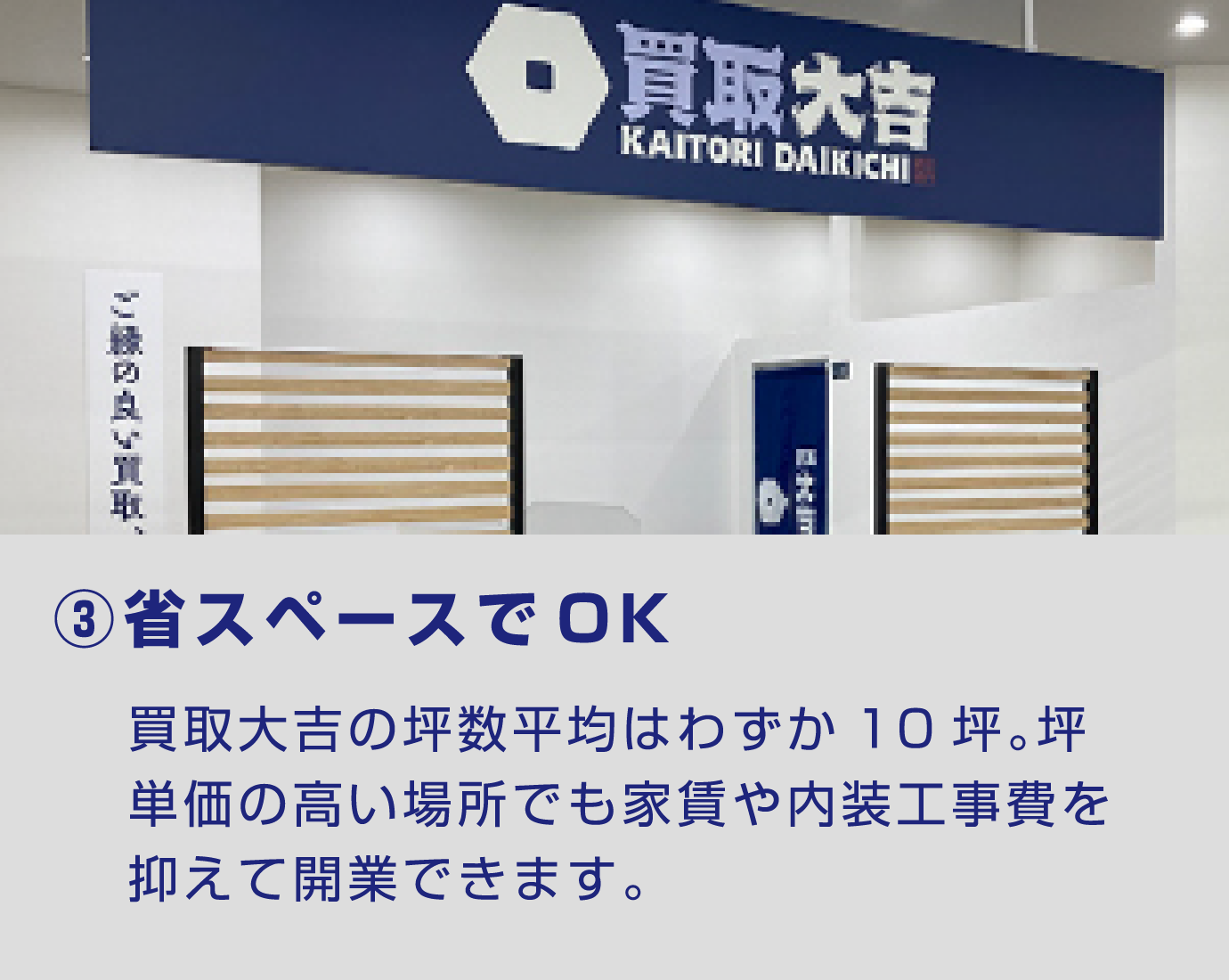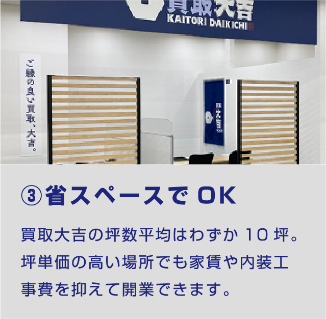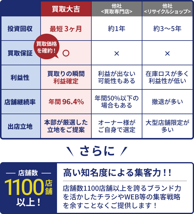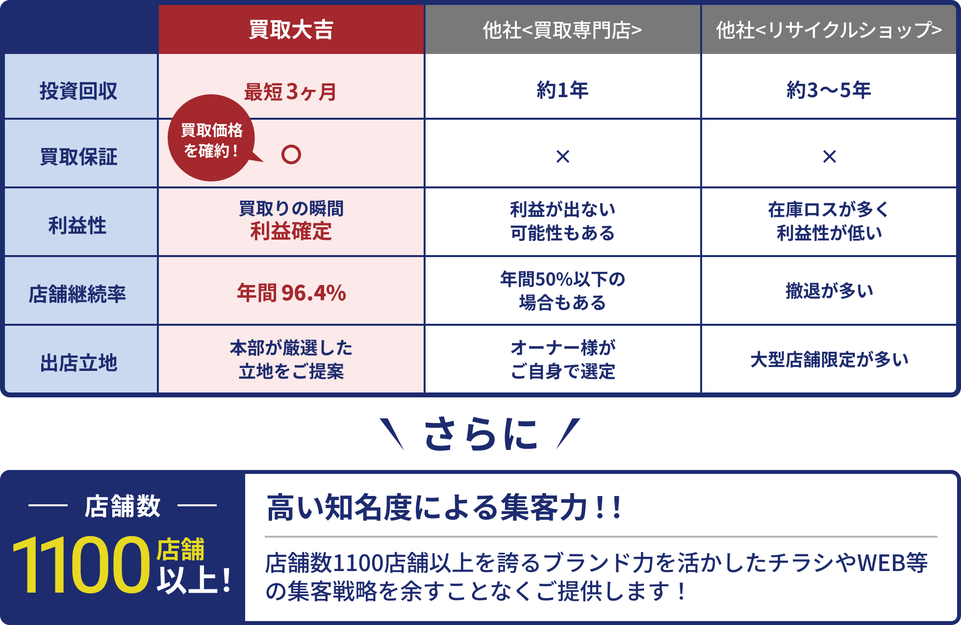 買取大吉は、ほかの買取専門店やリサイクルショップのフランチャイズに比べて、市場への認知度が高く、安定収益の仕組みを構築したことで、店舗経営が軌道に乗りやすい仕組みを実現しました。
