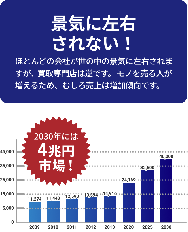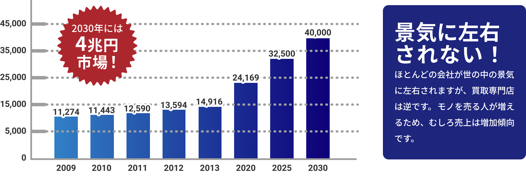 買取ビジネスもリサイクル業界の成長と共に急成長し、市場規模も拡大しています。