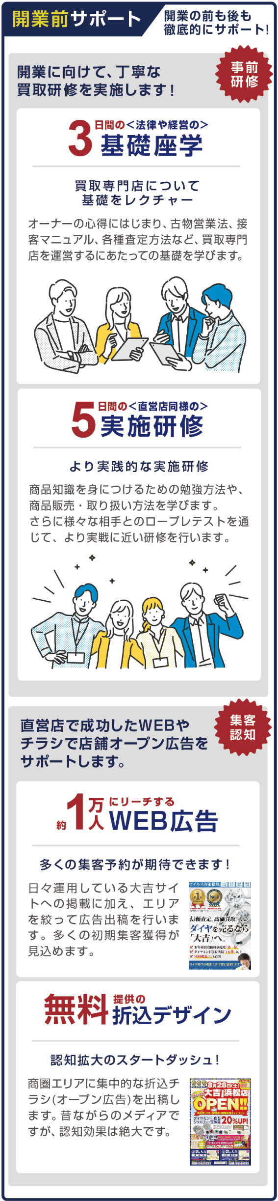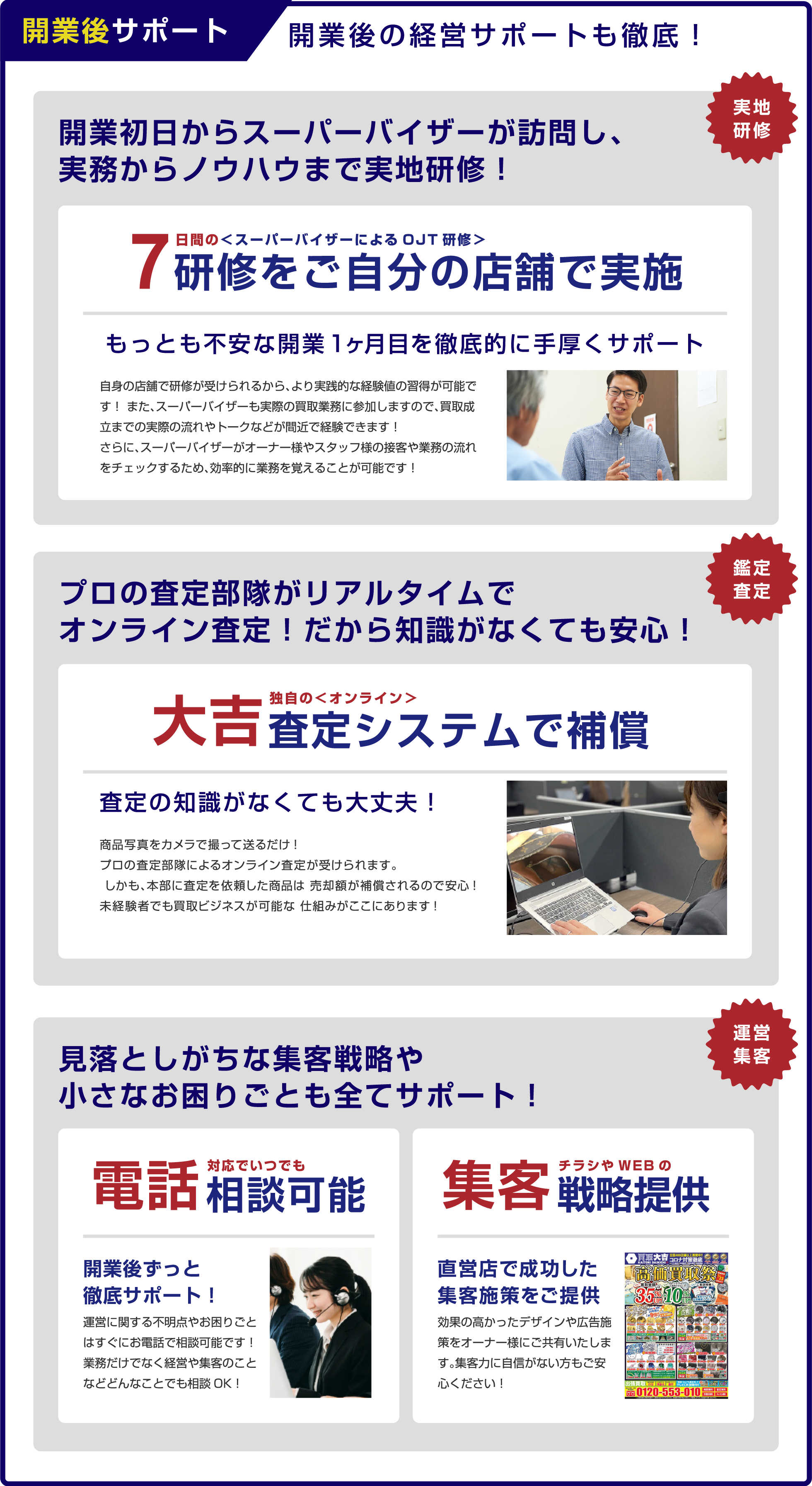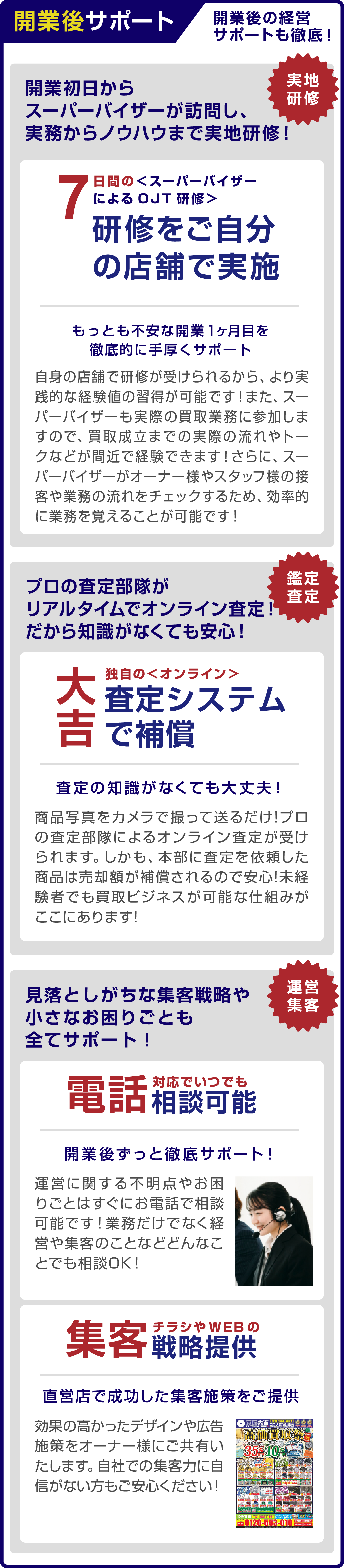 商品知識や査定の仕方、お店づくり、一日の実務の流れのおさらい、買取のロールプレイング、広告戦略などをマンツーマンでお教えいたします。不慣れなうちは、SVの接客や査定を参考にしていただきながらの運営が可能です。また、SV不在 時でもお困りになられないよう、オンラインでの査定や相談窓口も常設しております。
