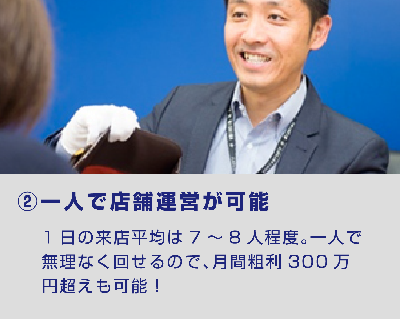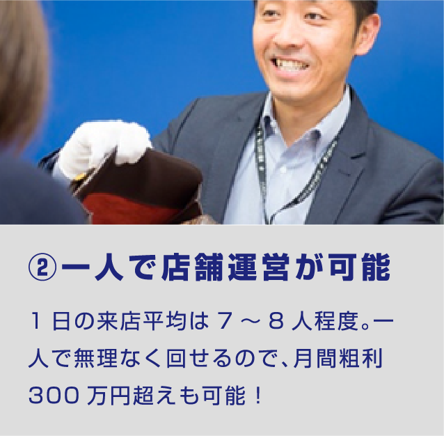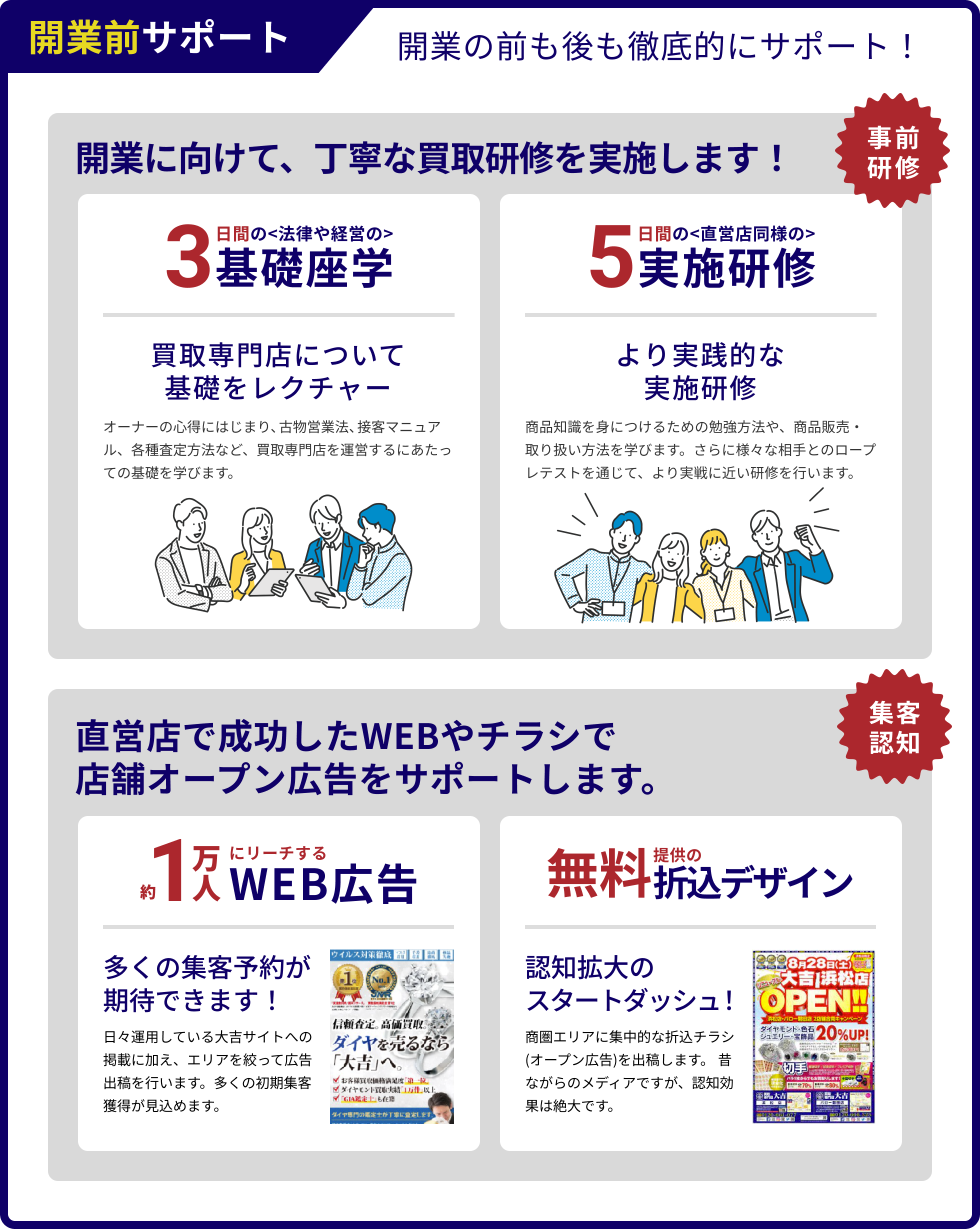 商品知識や査定の仕方、お店づくり、一日の実務の流れのおさらい、買取のロールプレイング、広告戦略などをマンツーマンでお教えいたします。不慣れなうちは、SVの接客や査定を参考にしていただきながらの運営が可能です。また、SV不在 時でもお困りになられないよう、オンラインでの査定や相談窓口も常設しております。