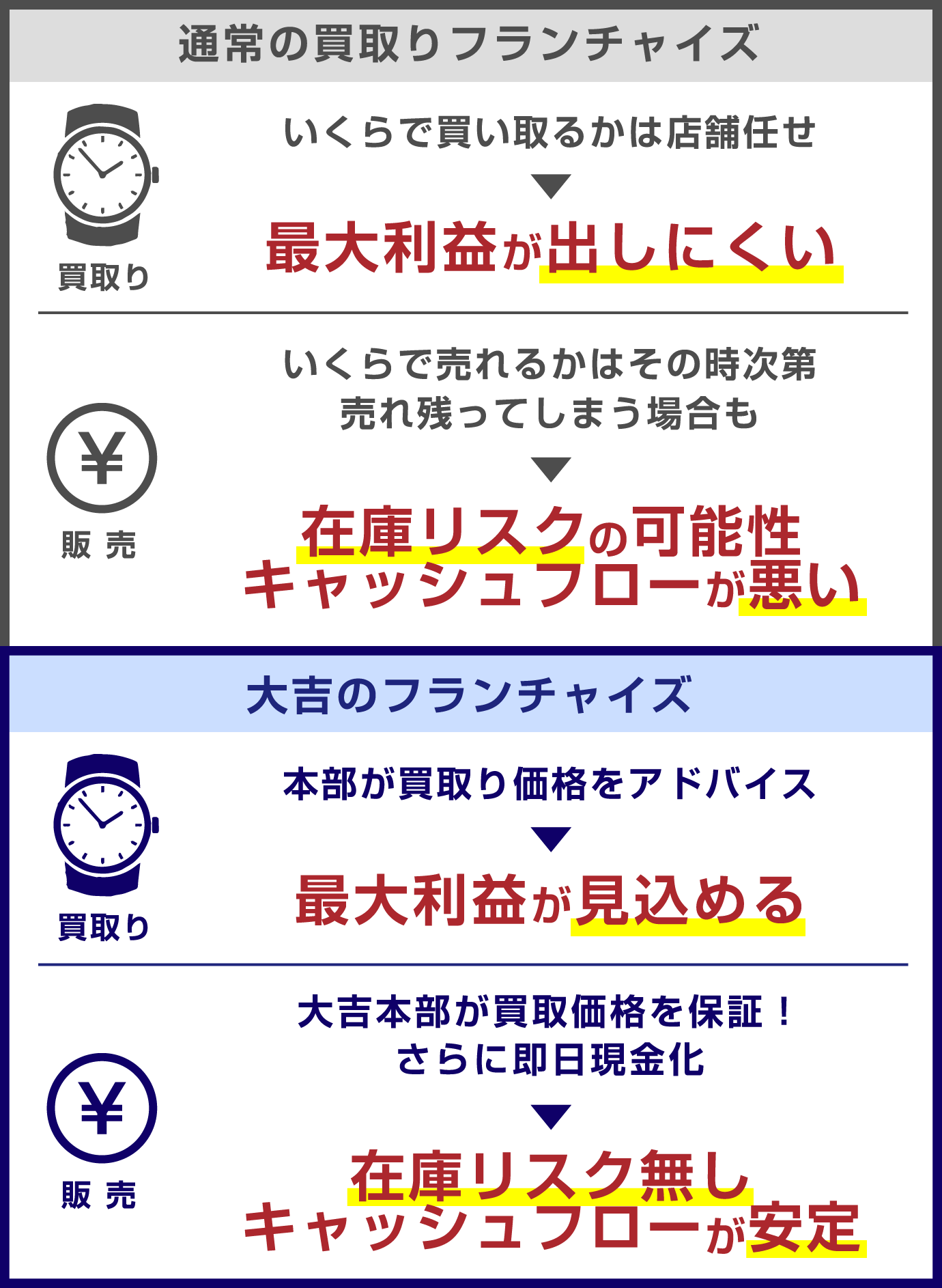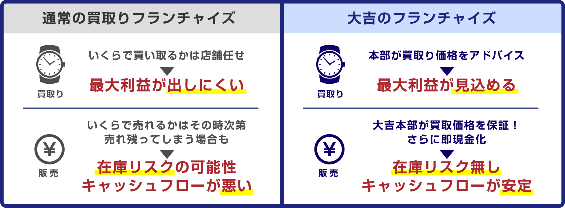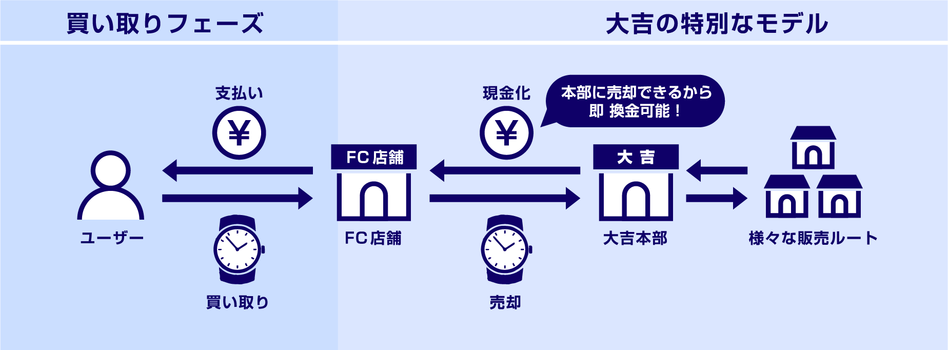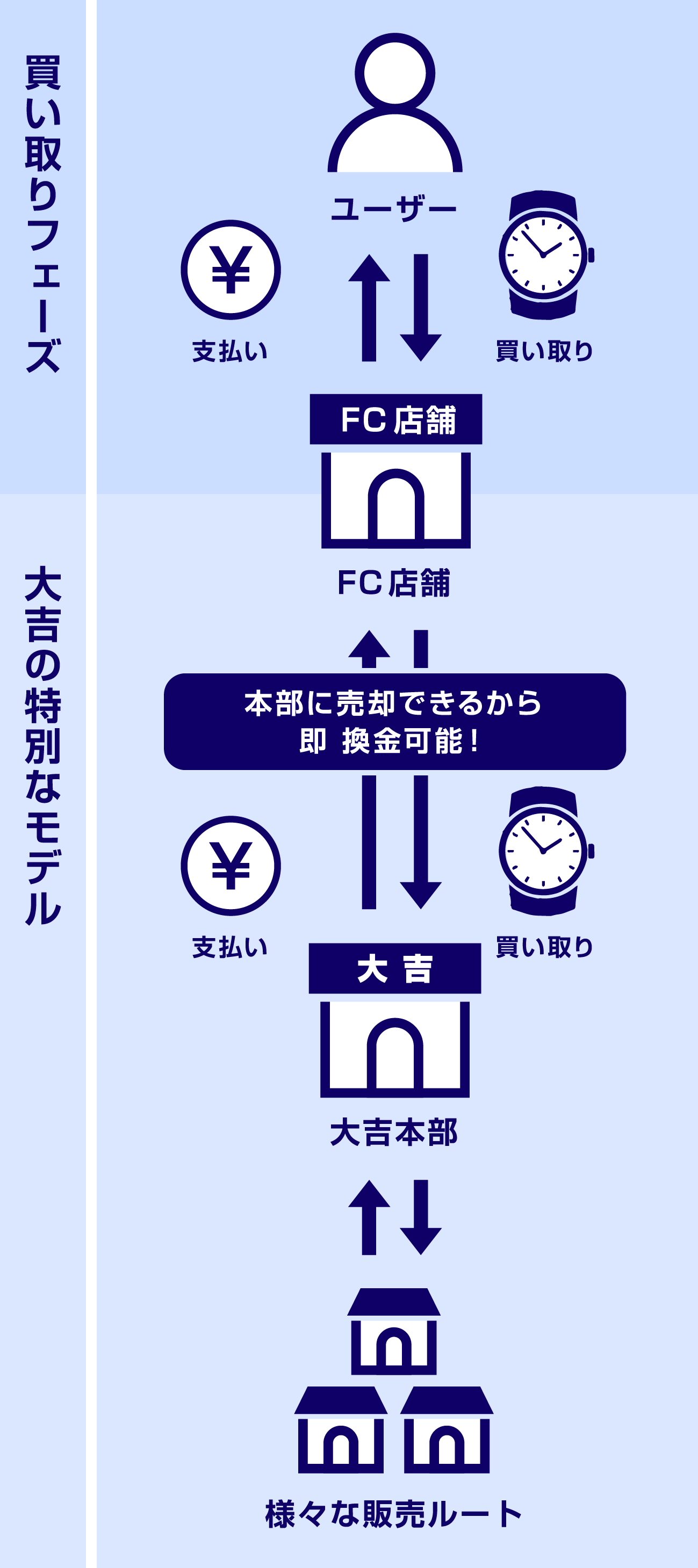 大吉なら、お客様から買い取った商品を本部が最短で買い取らせていただくことが可能なため、キャッシュフローがとても安定します!またお客様から買い取る前に本部への売却価格をお伝えできるため、損をすることはございません。
